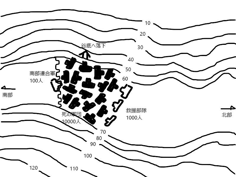 〈死の軍団〉はおよそ1万の兵力があるが、この狭いふもと峠では戦力を生かすことが出来ない。